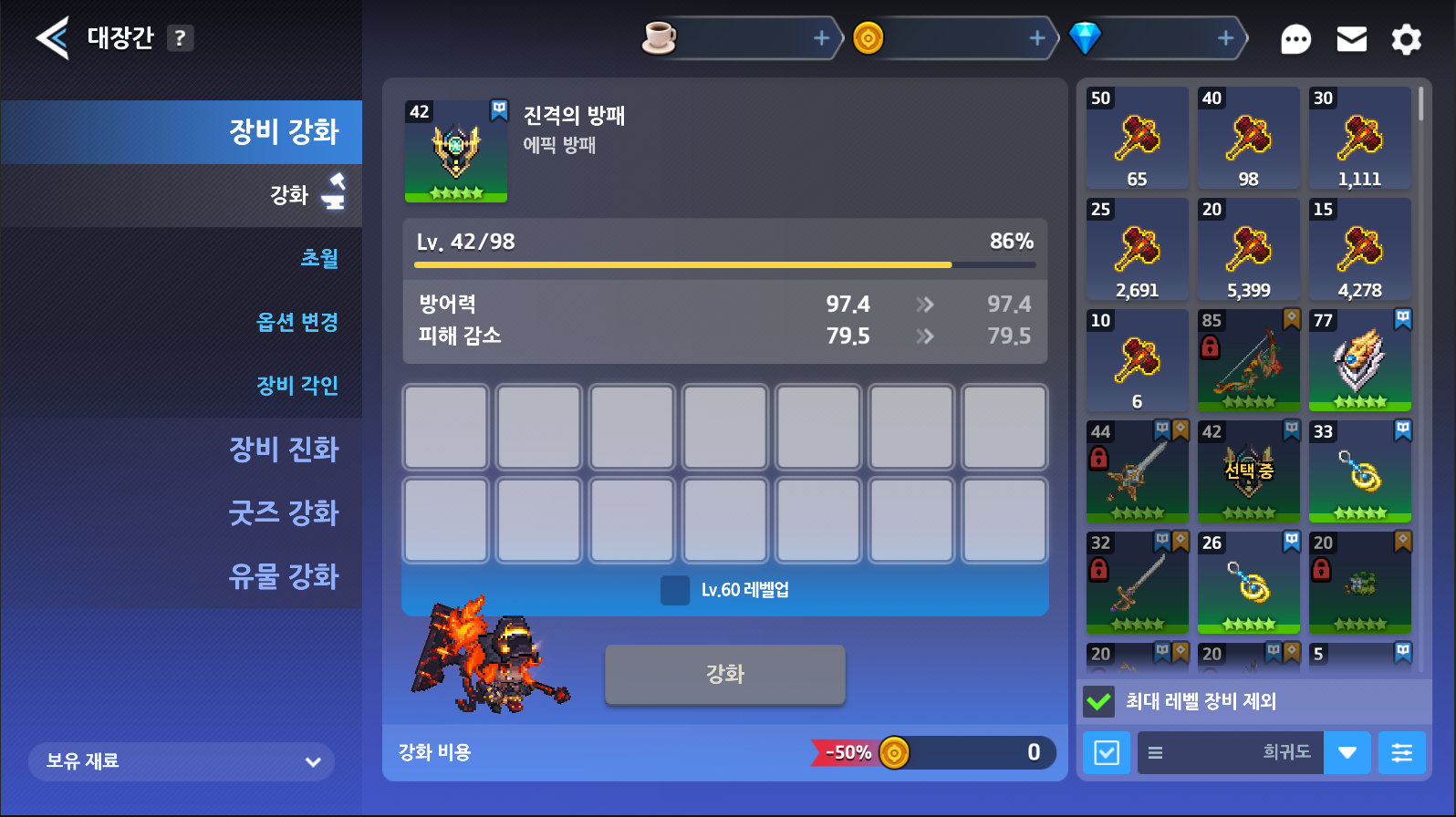 Atividade Desconto Aprimoramento de equipamento 50% Transcendência de equipamento 40% Evolução Fixa de equipamento 20% Gravura de equipamento 40%