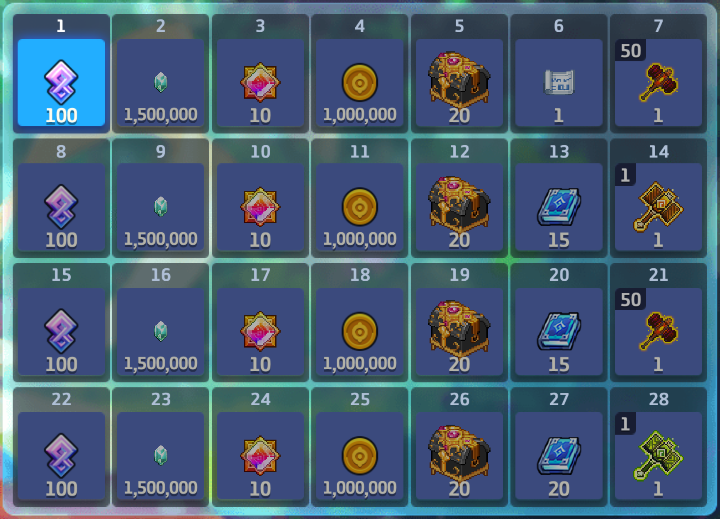 Temos mais um check-in diário? Claro que temos! Até 25/07, durante 20 dias corridos após se conectar pela primeira vez durante o evento, você poderá marcar presença e obter além de um pacote especial de adesivos de 4º aniversário, um martelo de transcendência épico e a carta especial de aniversário com a princesinha, até 100 controladores de convocação selecionável!