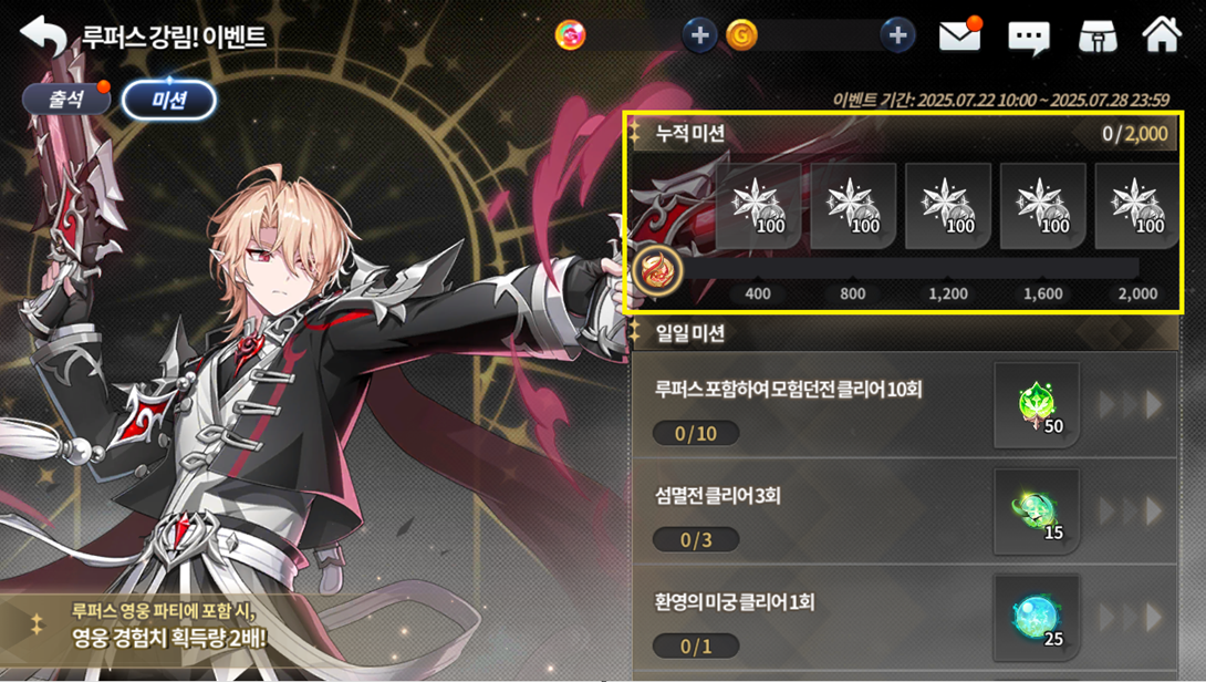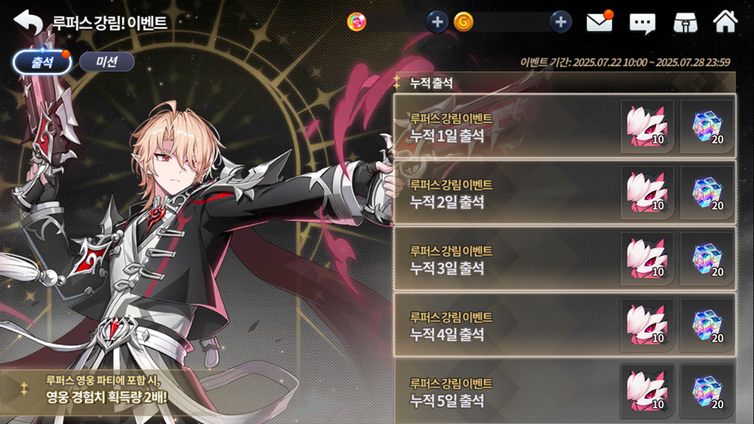 Vários eventos estarão disponíveis para que você possa aproveitar sua nova evolução! Até 28/07, não deixe de obter vários recursos no seu evento de Advento, como até 50 cópias da sua mascote S Lupe e 50 cubos de crescimento ao marcar até 5 dias de presença durante o evento, mais 500 cristais divinos para o Lupus ao consumir até 2000 energias, fora recursos completando o quadro de tarefas diárias e um buff de dobro de experiência de herói ao jogar com o Lupus no time.
