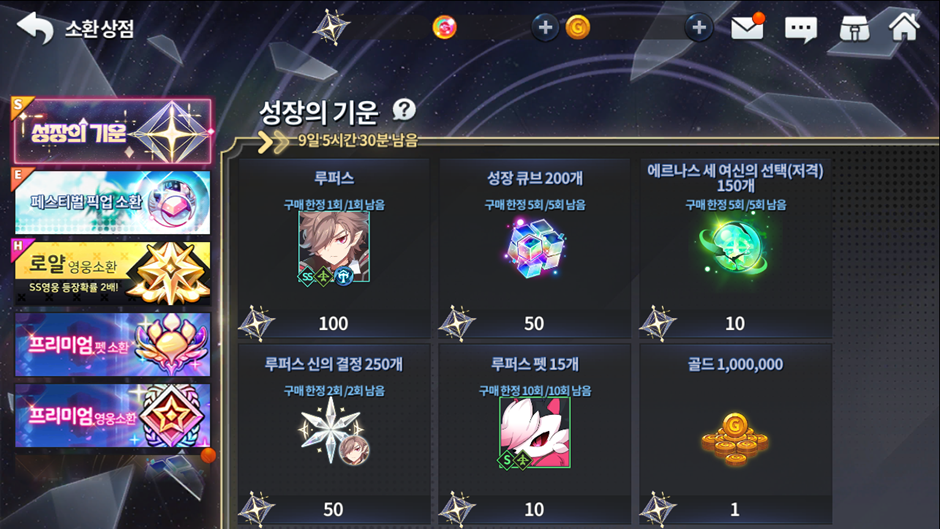 Produto Limite de compra Custo de pontos 1 Cópia da herói SR Lupus 1 100 250 cristais divinos pra Lupus 2 50 200 Cubos de Crescimento 5 50 15 cópias do Mascote S Lupe 10 10 150 Escolhas das três deusas de Ernas (Atirador) 5 10 1000000 Ouro Sem Limite 1