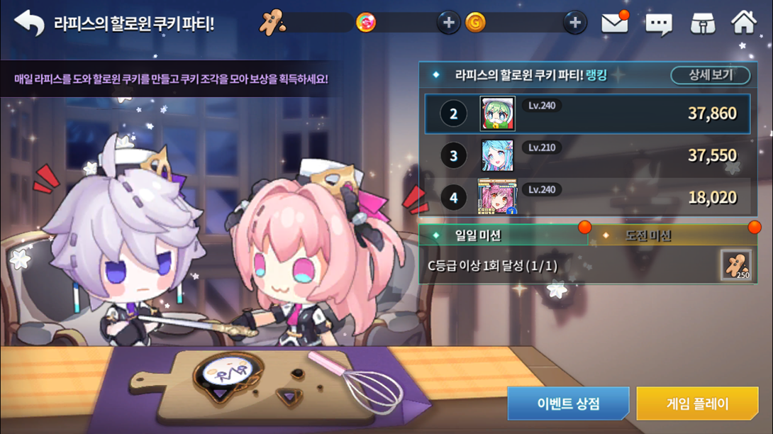 Tipo de missão Tarefa Quantidade de biscoitos recebida Desafio Obtenha rank B ou superior 3 vezes 100 Obtenha rank A ou superior 3 vezes Obtenha rank S ou superior 1 vez Diário Obtenha rank C ou superior 1 vez 250