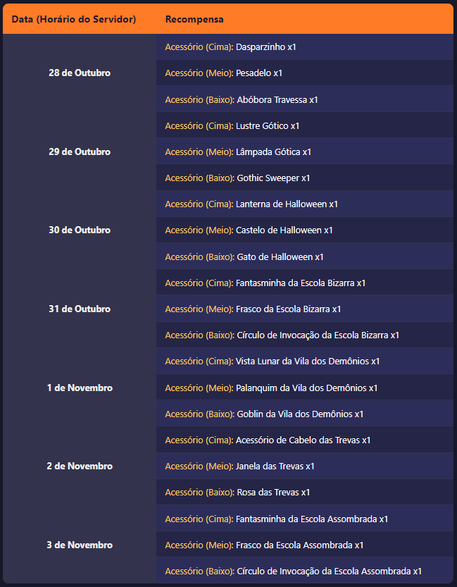 Realizando missões diárias e especiais, você recebe Biscoitos de Halloween que podem ser trocados na loja por recursos imperdíveis. Você também poderá rankear no evento e ao final dele, receberá premiações em gemas dependendo da sua colocação.