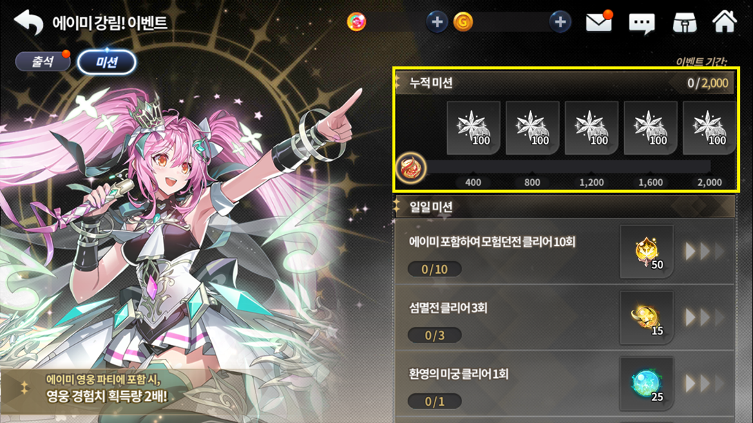 Missão Diária Conteúdo da Missão Diária Recompensa da Missão Diária Missão 1 Concluir 10 calabouços de aventura com o Amy no time 50 essências do crescimento de Sacerdote Missão 2 Concluir Modo Defesa 3 vezes 15 Escolhas das Três Deusas de Ernas (Sacerdote) Missão 3 Concluir 1 vez o Labirinto Fantasmagórico 25 Graças das Três Deusas de Ernas Missão 4 Receber recompensa de Procurado 1 vez 25 Graças das Três Deusas de Ernas Missão 5 Jogar PvP 3 vezes 500 Bênçãos da Bravura