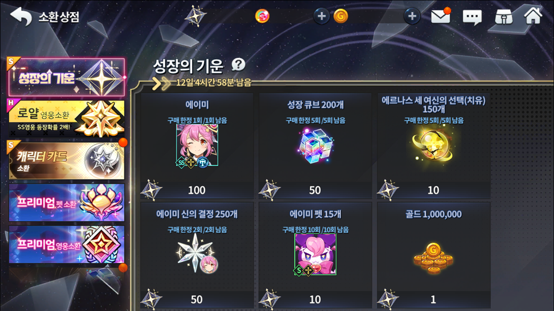 Produto Limite de compra Custo de pontos 1 Cópia da herói SR Amy 1 100 250 cristais divinos pra Amy 2 50 200 Cubos de Crescimento 5 50 15 cópias do Mascote S Musa 10 10 150 Escolhas das três deusas de Ernas (Sacerdote) 5 10 1000000 Ouro Sem Limite 1