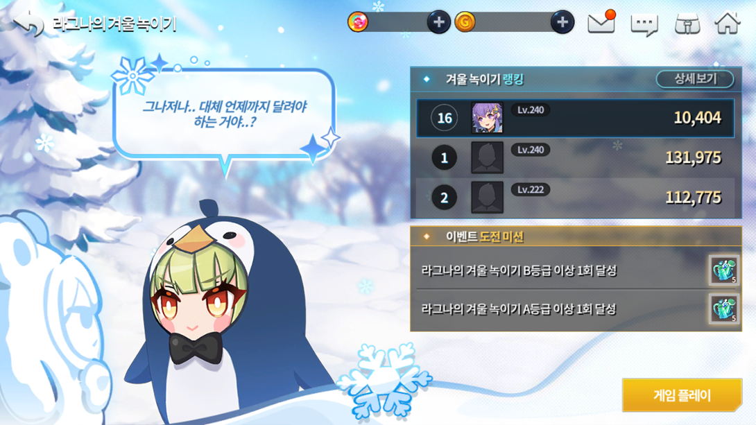 O mini-game: Colapso de Inverno da Ragna pode ser jogado e assim você pode obter prêmios seja pela sua classificação semanal ou pelas quests diárias, semanais ou limitadas completadas. O mini-game é um jogo estilo Subway Surfers onde você deve percorrer a maior distância possível coletando o máximo de moedas douradas na tela e desviar dos obstáculos utilizando nossa rata verde favorita!