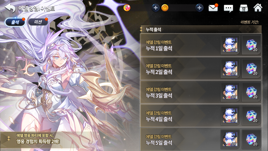 Vários eventos estarão disponíveis para que você possa aproveitar sua nova evolução! Até 15/12, não deixe de obter vários recursos no seu evento de Advento, como até 50 cópias da sua mascote S Dia e 100 cubos de crescimento ao marcar até 5 dias de presença durante o evento, mais 500 cristais divinos para a Edel ao consumir até 2000 energias, fora recursos completando o quadro de tarefas diárias e um buff de dobro de experiência de herói ao jogar com a personagem no time.