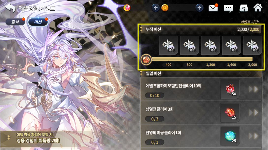 Missão Diária Conteúdo da Missão Diária Recompensa da Missão Diária Missão 1 Concluir 10 calabouços de aventura com a Edel no time 50 essências do crescimento de Guerreiro Missão 2 Concluir Modo Defesa 3 vezes 15 Escolhas das Três Deusas de Ernas (Guerreiro) Missão 3 Concluir 1 vez o Labirinto Fantasmagórico 25 Graças das Três Deusas de Ernas Missão 4 Receber recompensa de Procurado 1 vez 25 Graças das Três Deusas de Ernas Missão 5 Jogar PvP 3 vezes 500 Bênçãos da Bravura