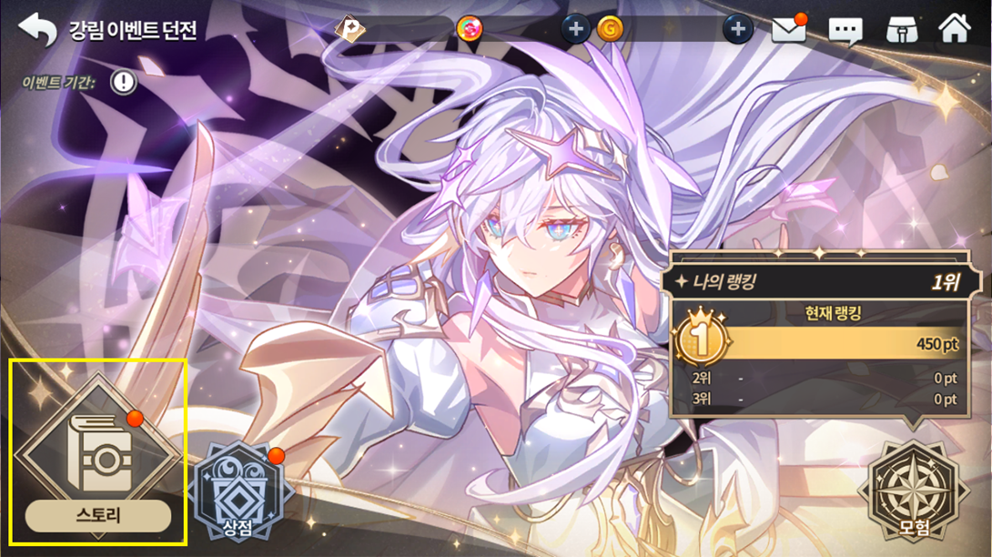 Assim como esse tipo de evento, há um ranking de pontos obtidos que dará prêmios com base na classificação e caso você não desbloquear os 4 capítulos da história do evento, após terminá-lo, só será possível acessar a história do mesmo desbloqueando cada capitulo por 300 gemas na enciclopedia de história de evento. E dentre os prêmios da loja de pontos do evento, teremos o lobby exclusivo do advento da personagem!