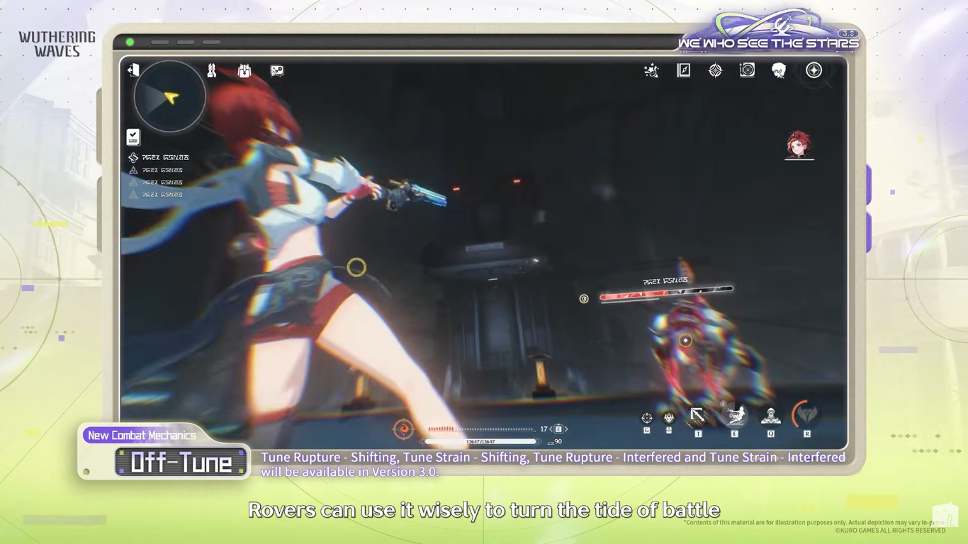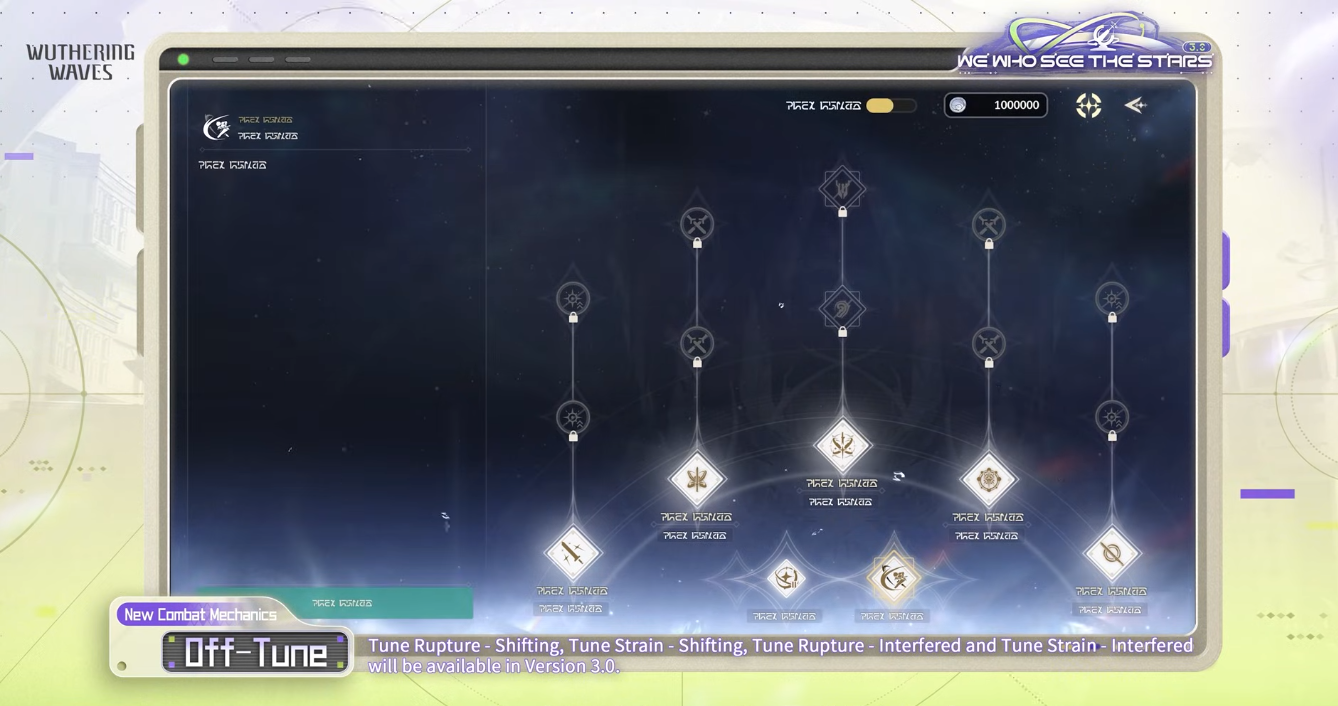 ➣ Nova mecânica de Combate, Off-Tune e Mistune: Uma nova mecânica será adicionada ao jogo. Os ataques dos personagens vão subir o nível Off-Tune. Assim que o nível Off-Tune do inimigo chegar ao limite, eles entrarão no estado Mistune. Durante o estado Mistune do inimigo, seus personagens podem soltar uma nova habilidade, o Tune Break, dando dano adicional. Acertar um Tune Break reseta o nível Off-Tune dos inimigos. Essas habilidades darão dano de Tune Break, elas também podem reduzir a Força de Vibração (stamina) e interromper padrões de ataques dos inimigos acertados.