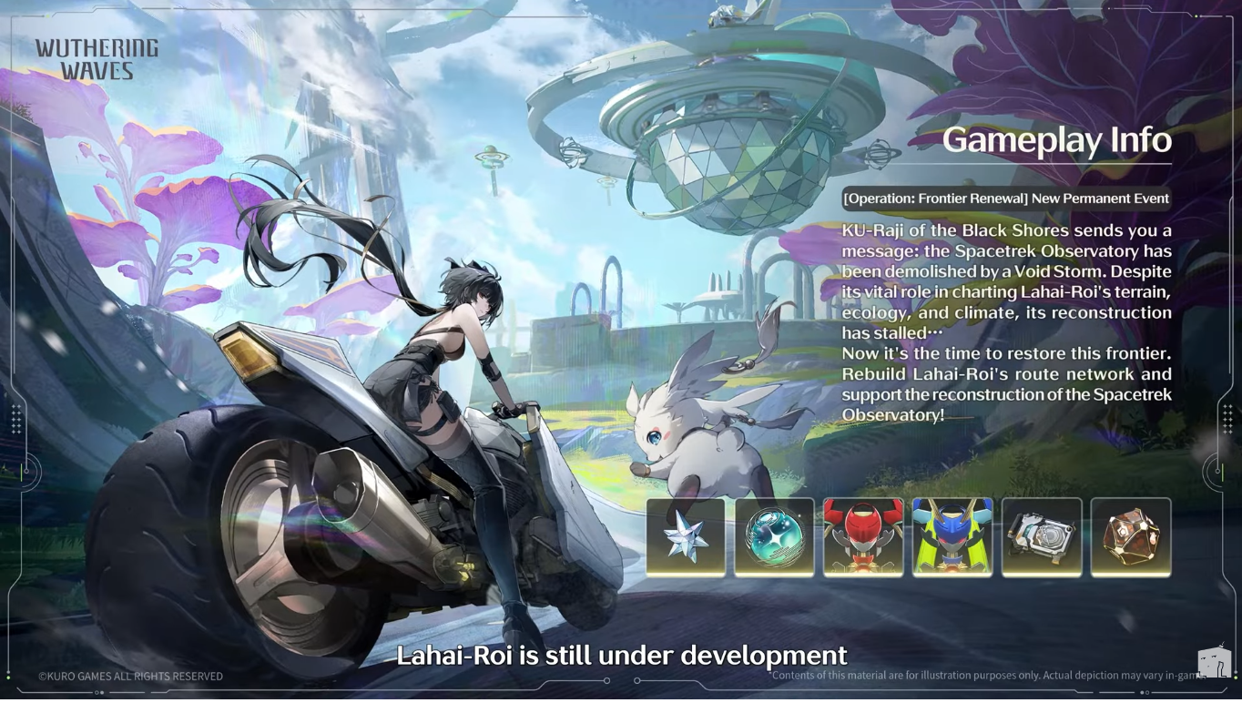➣ Operação - Renovação da Fronteira (Evento Permanente): Através desse evento, nós participaremos do desenvolvimento de Lahai-Roi. Coletando materiais, poderemos reconstruir construções e desenvolver rotas de transporte, assim habilitando novos locais. Conforme avançamos, iremos construir o Observatório Spacetrek, através dele poderemos controlar o clima da região, assim podendo influenciar o ambiente e a exploração. Neste evento poderemos ganhar uma variedade de recompensas, entre elas, novas cores para os Echos “Phantom Twin Nova: Collapsar Blade” e “Phantom Twin Nova: Nebulous Cannon”.