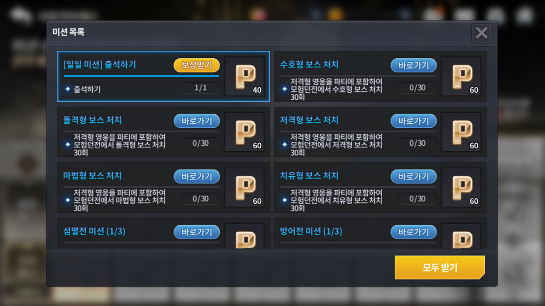 Tipo da missão Missão Quantidade de pontos ganhas Missão diária Conecte-se durante o período do evento 40 Missões cumulativas Conclua 9 vezes o Extermínio 30 Conclua 12 vezes o Extermínio Conclua 15 vezes o Extermínio Conclua 9 vezes o modo Defesa Conclua 12 vezes o modo Defesa Conclua 15 vezes o modo Defesa Missões cumulativas Derrotar 30 chefes do tipo Mago com herói Atirador em calabouços de aventura 40 Derrotar 30 chefes do tipo Guardião com herói Atirador em calabouços de aventura Derrotar 30 chefes do tipo Guerreiro com herói Atirador em calabouços de aventura Derrotar 30 chefes do tipo Atirador com herói Atirador em calabouços de aventura Derrotar 30 chefes do tipo Sacerdote com herói Atirador em calabouços de aventura
