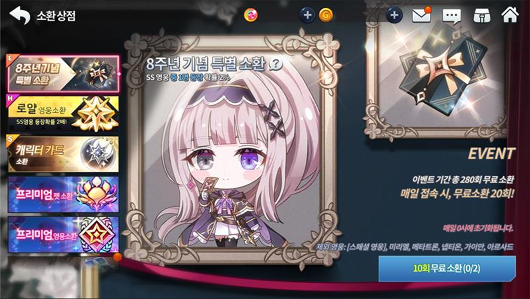 No mesmo período, você poderá conseguir vários heróis no Evento especial de invocação, podendo dar 20 giros grátis diariamente e obter personagens com exceção das trocas de classe, personagens especiais, Arsad, Gaian, Myriel, Neption e Metatron.