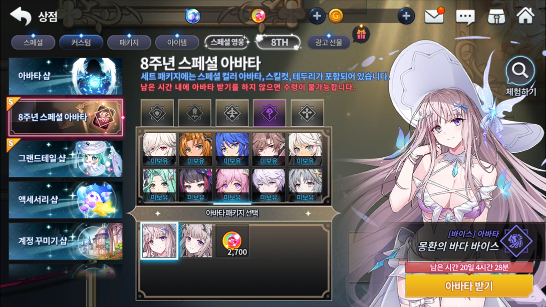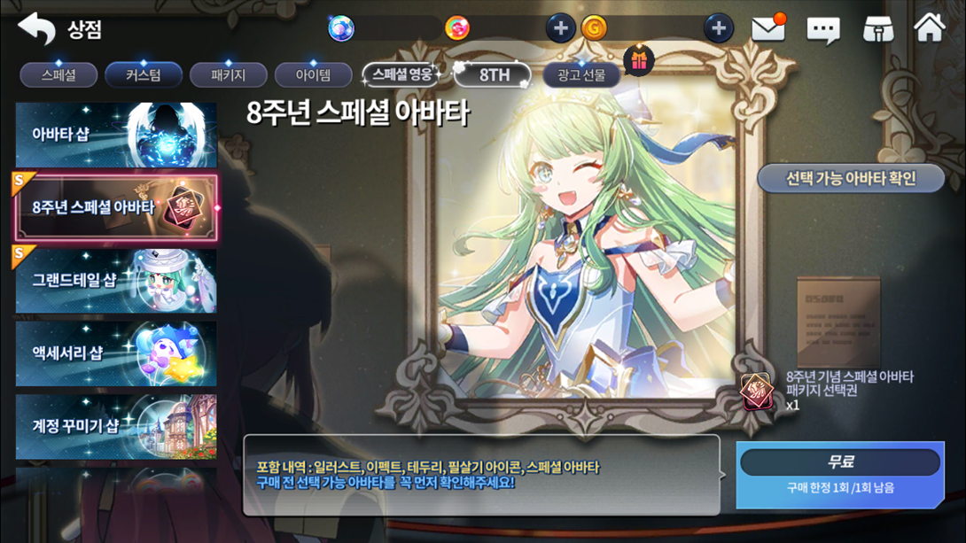 Produto Limite de compra Custo de pontos Lobby do 8º aniversário 1 17000 Lobby de Habilidade Especial: O Sonho Umbroso, Ai(T) Lobby de Habilidade Especial: O Sonho Umbroso, Mayden(T) Lobby de Habilidade Especial: O Sonho Umbroso, Asin Lobby de Habilidade Especial: O Sonho Umbroso, Vice (Evento) Ticket de herói SR selecionável 1 7000 50 Cubos de Crescimento 5 1500 (Não negociável) Ticket de recompensa do Altar do Tempo 60 450 125 cristais divinos 12 850 100 Graças das três deusas de Ernas 9 280 100 tickets de acessórios 20 400 100000 Ouro Sem Limite 10
