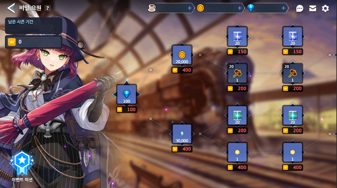 Desafio Pontos Recebidos Primeira Conclusão do Estágio (Campanha principal, história secundária ou história curta) 150 Primeira Conclusão do sub-estágio da campanha principal 100 Primeira Conclusão da história secundária no modo desafio Conclusão de Rachadura Conclusão de Labirinto (Normal e elementos) Conclusão da Guerra dos Heróis de Tetis Concluir o estágio normal da Expedição Concluir o estágio secreto da Expedição pela primeira vez Concluir o estágio secreto em grupo da Expedição pela primeira vez Concluir o estágio de chefe da Expedição Jogar o Coliseum 60 Jogar o calabouço de pedras de despertar (Proporcional ao nível jogado) 180