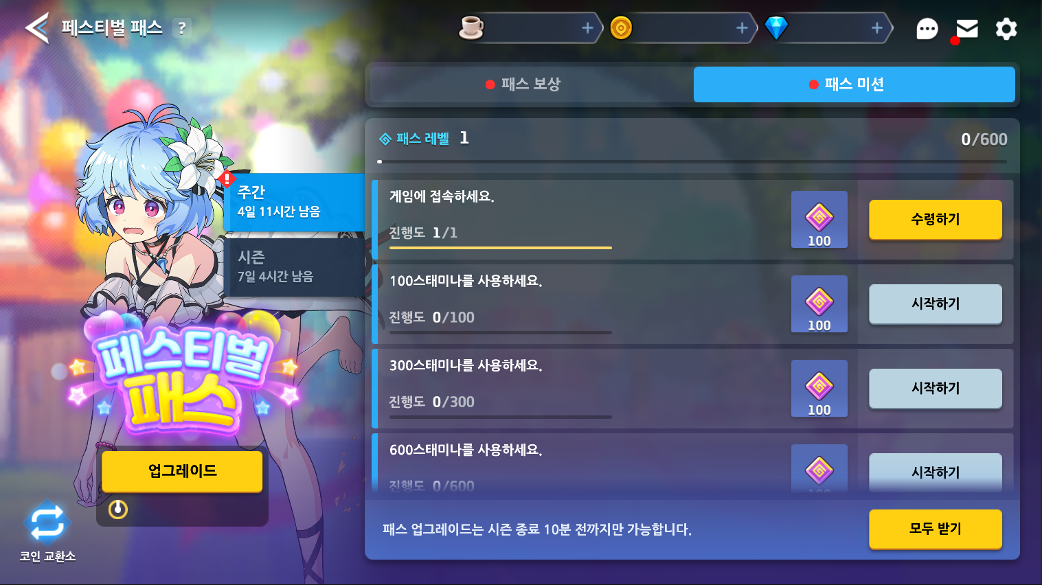 Desafio Pontos Recebidos Primeira Conclusão do Estágio (Campanha principal, história secundária ou história curta) 150 Primeira Conclusão do sub-estágio da campanha principal 100 Primeira Conclusão da história secundária no modo desafio Conclusão de Rachadura Conclusão de Labirinto (Normal e elementos) Conclusão da Guerra dos Heróis de Tetis (Limpeza) Concluir o estágio normal da Expedição Concluir o estágio secreto da Expedição pela primeira vez Concluir o estágio secreto em grupo da Expedição pela primeira vez Concluir o estágio de chefe da Expedição Jogar o Coliseum 60 Jogar o calabouço de pedras de despertar (Proporcional ao nível jogado) 180