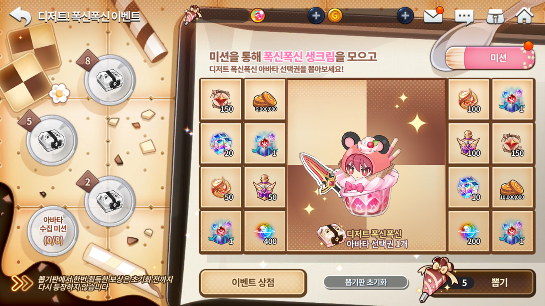 Através de missões especiais, você obtém Chantilis da Fofura que podem ser utilizados para girar na cartela e obter vários prêmios, incluindo os avatares especiais selecionáveis para qualquer personagem disponível (Todos os SR's e trocas de classe, com exceção de Cindy, Grandiel, Arsad e Gaian por não possuírem modelagem em 3D).
