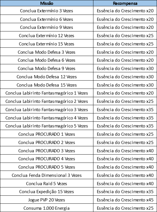Tipo da missão Missão Quantidade de chantilis ganhas Missão diária Conecte-se durante o período do evento 5 Jogue 3 PVP's 3 Missão repetível Consuma 200 energias Missão Semanal Conclua 3 vezes o Extermínio 2 Conclua 6 vezes o Extermínio Conclua 9 vezes o Extermínio Conclua 12 vezes o Extermínio Conclua 15 vezes o Extermínio Conclua 3 vezes o modo Defesa Conclua 6 vezes o modo Defesa Conclua 9 vezes o modo Defesa Conclua 12 vezes o modo Defesa Conclua 15 vezes o modo Defesa Conclua uma vez o Labirinto Fantasmagórico Conclua 2 vezes o Labirinto Fantasmagórico Conclua 3 vezes o Labirinto Fantasmagórico Conclua 4 vezes o Labirinto Fantasmagórico Conclua 5 vezes o Labirinto Fantasmagórico Receba 1 recompensa do Procurado Receba 2 recompensas do Procurado Receba 3 recompensas do Procurado Receba 4 recompensas do Procurado Receba 5 recompensas do Procurado Conclua 3 Fendas Dimensionais 3 Conclua 5 Raids