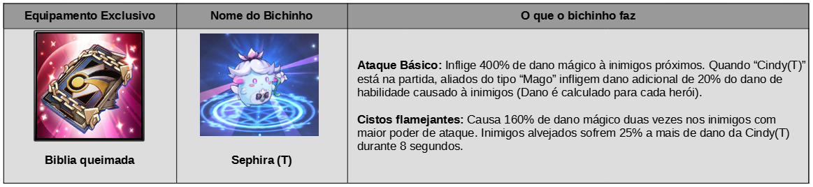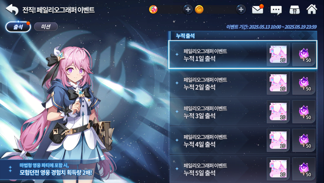 Até 20/05,receba até 100 cubos de Crescimento da Cindy(T) ao consumir 1000 energias e vários recursos completando missões diárias, junto do selo diário que dará até 50 cópias da mascote S Sephira e 250 essências de Crescimento de Mago ao se conectar durante o período do evento. Mais um buff que dará dobro de experiência de herói em calabouços de aventura ao jogar com personagens tipo Mago no grupo.