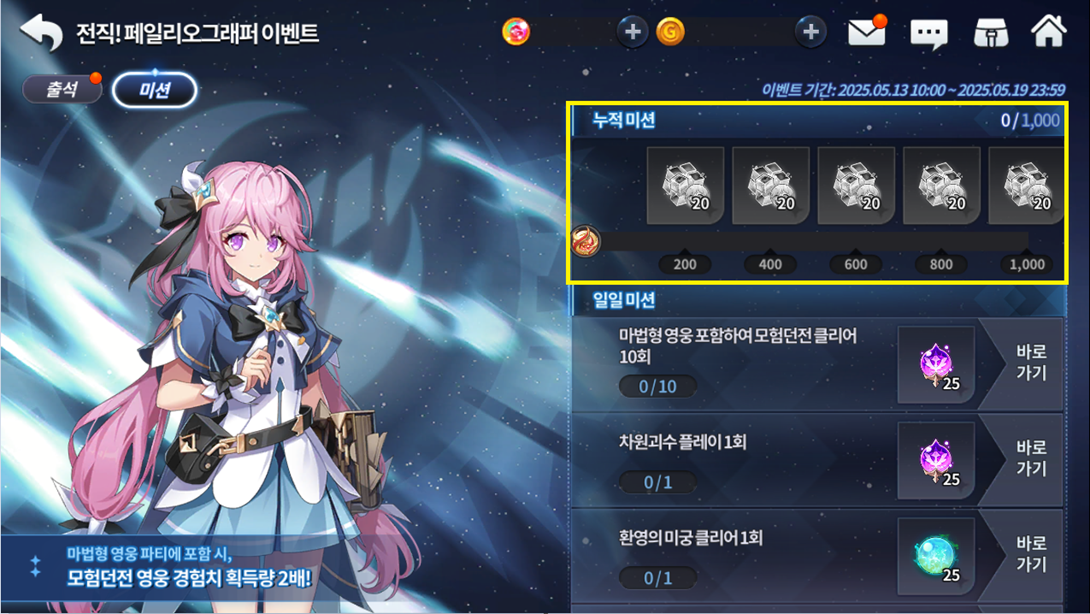 Etapa Missão Premiação 1 Concluir 10 calabouços de aventura com herói do tipo Mago no grupo 25 Essências de Crescimento de Mago 2 Desafiar 1 chefe dimensional 25 Essências de Crescimento de Mago 3 Concluir 1 Labirinto Fantasmagórico 25 Bençãos da Deusa de Ernas 4 Receba 1 recompensa do Procurado 25 Bençãos da Deusa de Ernas 5 Jogue PVP 3 vezes 100 Poções avançadas de treinamento