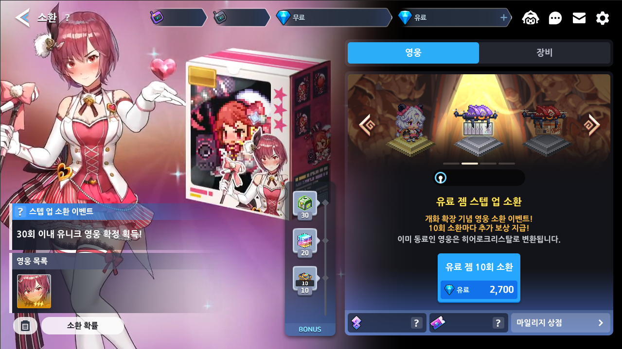 No mesmo período, o evento de jóias pagas para obter a Eva Idol garantido estará disponível. Neste banner, ao realizar 10 invocações com joias pagas, você não só tem a chance de garantir a personagem ao conseguir um herói Nat5, como também à cada 10 convocações feitas.