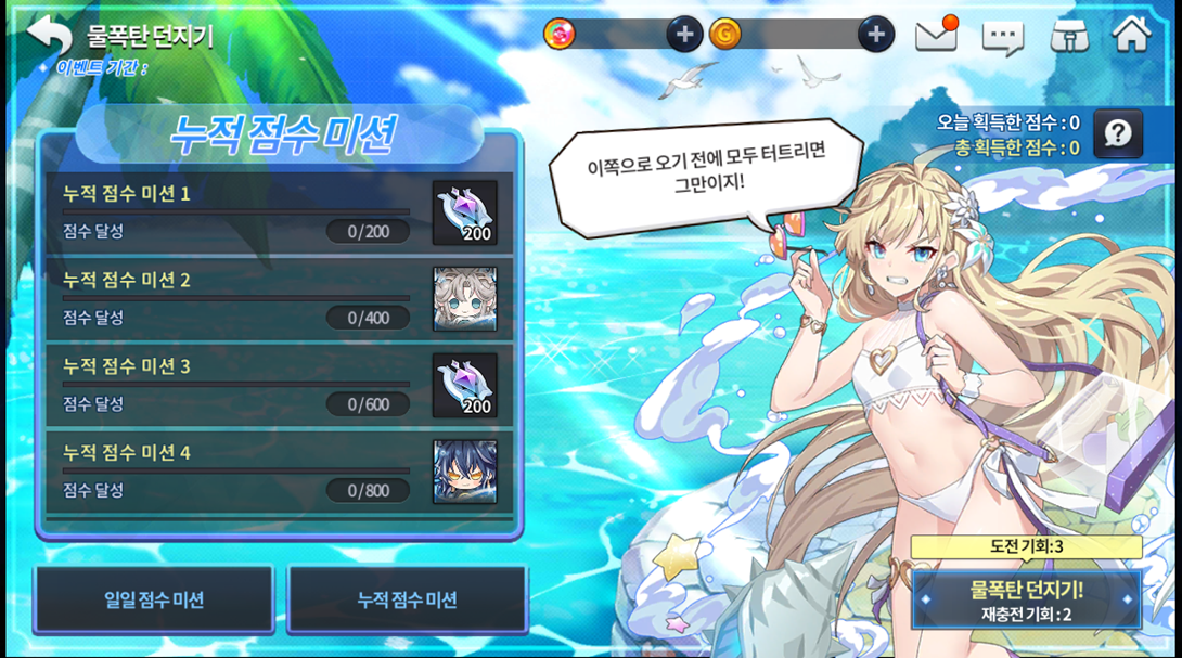 No mesmo período, quem retorna é o evento Atirar bombas d'água. A cada dia, você recebe 3 entradas grátis (com 3 entradas adicionais por 100 gemas cada. Limite de 2 recargas extras) para poder jogar o mini-game.