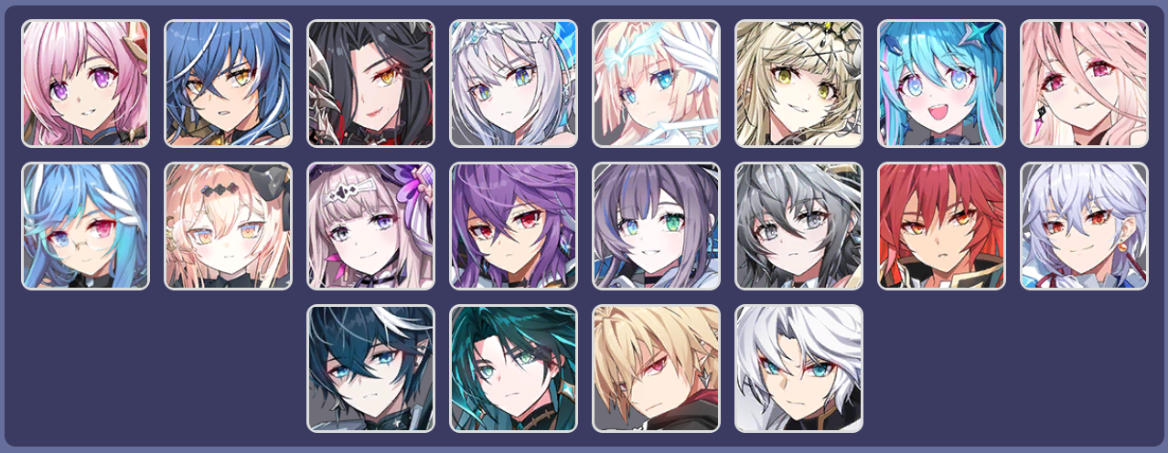 Você poderá abrir para qualquer personagem da rotação atual (Conforme a imagem e a lista abaixo) utilizando as Chaves de Conta Selada. Ao abri-la, você obterá uma das partes do conjunto selecionável para os heróis disponíveis.