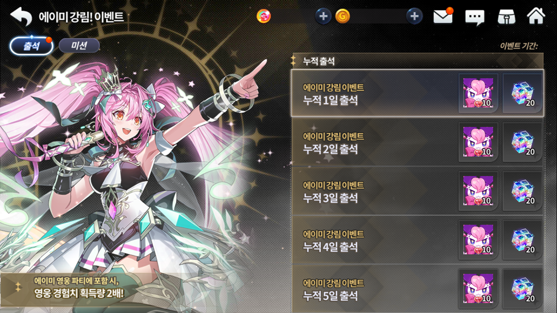 Vários eventos estarão disponíveis para que você possa aproveitar sua nova evolução! Até 03/11, não deixe de obter vários recursos no seu evento de Advento, como até 50 cópias da sua mascote S Musa e 100 cubos de crescimento ao marcar até 5 dias de presença durante o evento, mais 500 cristais divinos para a Amy ao consumir até 2000 energias, fora recursos completando o quadro de tarefas diárias e um buff de dobro de experiência de herói ao jogar com a Amy no time.