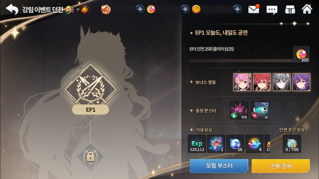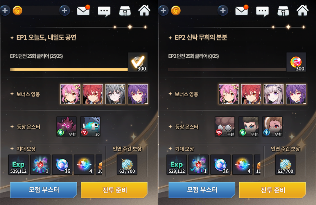 Assim como nos eventos de história,caso jogar com personagens bônus em seu time, receberá até 50% de pontos extras dependendo de quantos heróis bônus você tenha incluso. Importante frisar que cada calabouço tem um time específico do evento e aqui, você poderá também completar missões de repetição de calabouço como teste de troca de classe, evolução colossal e até mesmo missões de advento.
