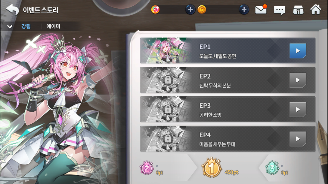 Assim como esse tipo de evento, há um ranking de pontos obtidos que dará prêmios com base na classificação e caso você não desbloquear os 4 capítulos da história do evento, após terminá-lo, só será possível acessar a história do mesmo desbloqueando cada capitulo por 300 gemas na enciclopedia de história de evento.
