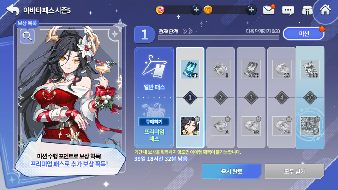 Nível Recompensa Passe Comum Recompensa Passe Premium 1º Nível 50 cupons de acessório Avatar Beijo agridoce, Nellia(T) 2º Nível 15 chaves selecionáveis da Grand Fábula 75 chaves selecionáveis da Grand Fábula 3º Nível 50 cupons de acessório 75 chaves de conta selada 4º Nível 15 chaves de conta selada 75 chaves de conta selada 5º Nível 5 cupons de avatar Ilustração Beijo agridoce, Nellia(T) 6º Nível 50 cupons de acessório 75 chaves selecionáveis da Grand Fábula 7º Nível 15 chaves selecionáveis da Grand Fábula 75 chaves selecionáveis da Grand Fábula 8º Nível 50 cupons de acessório 75 chaves de conta selada 9º Nível 15 chaves de conta selada 75 chaves de conta selada 10º Nível 5 cupons de avatar Avatar Beijo agridoce, Nellia(T) Especial 11º Nível 100 cupons de acessório 150 chaves selecionáveis da Grand Fábula 12º Nível 30 chaves selecionáveis da Grand Fábula 150 chaves selecionáveis da Grand Fábula 13º Nível 100 cupons de acessório 150 chaves de conta selada 14º Nível 30 chaves de conta selada 150 chaves de conta selada 15º Nível 5 cupons de avatar 50 cupons de avatar 16º Nível 100 cupons de acessório 150 chaves selecionáveis da Grand Fábula 17º Nível 30 chaves selecionáveis da Grand Fábula 150 chaves selecionáveis da Grand Fábula 18º Nível 100 cupons de acessório 150 chaves de conta selada 19º Nível 30 chaves de conta selada 150 chaves de conta selada 20º Nível 10 cupons de avatar Lobby: História de Natal (Caso você já o possua, receberá 100 cupons de avatar no lugar)