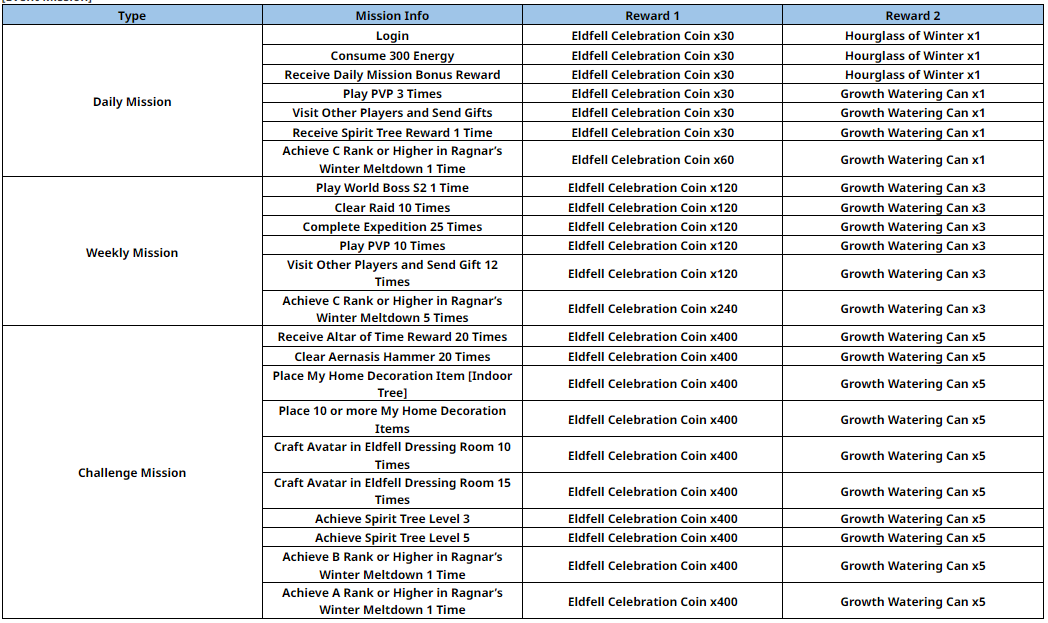 A terceira modalidade é um quadro de missões especiais que ao serem completadas diariamente, semanalmente ou durante o período do evento, te dará moedas celebrativas de Eldepel e Regadores de Crescimento.