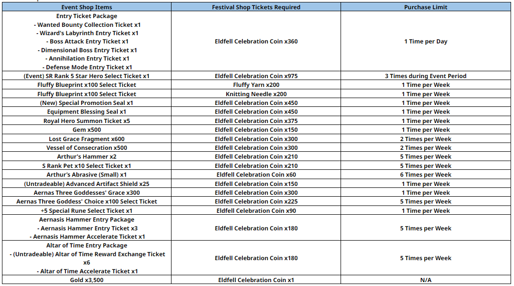 Produto Limite de compra Custo de pontos 1 Cópia da herói SR Edel 1 100 250 cristais divinos pra Edel 2 50 200 Cubos de Crescimento 5 50 15 cópias do Mascote S Dia 10 10 150 Escolhas das três deusas de Ernas (Guerreiro) 5 10 1000000 Ouro Sem Limite 1