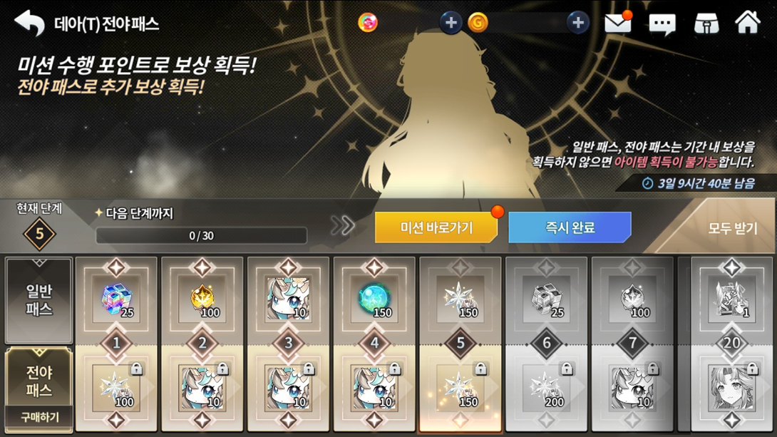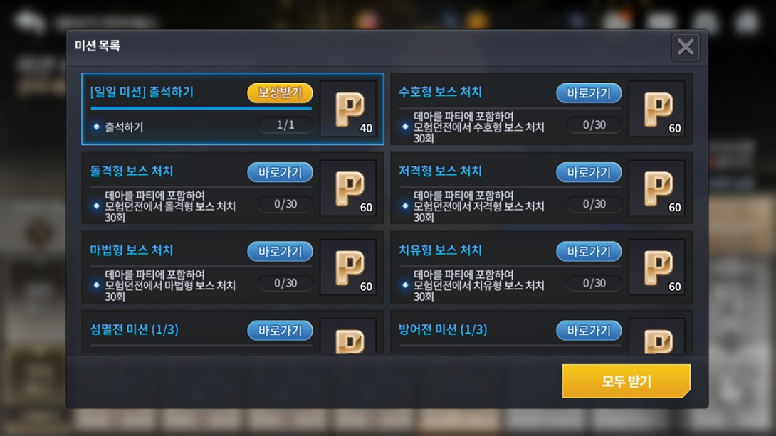 Tipo da missão Missão Quantidade de pontos ganhas Missão diária Conecte-se durante o período do evento 40 Missões cumulativas Conclua 9 vezes o Extermínio 30 Conclua 12 vezes o Extermínio Conclua 15 vezes o Extermínio Conclua 9 vezes o modo Defesa Conclua 12 vezes o modo Defesa Conclua 15 vezes o modo Defesa Missões cumulativas Derrotar 30 chefes do tipo Sacerdote com Déa em calabouços de aventura 40 Derrotar 30 chefes do tipo Guardião com Déa em calabouços de aventura Derrotar 30 chefes do tipo Guerreiro com Déa em calabouços de aventura Derrotar 30 chefes do tipo Mago com Déa em calabouços de aventura Derrotar 30 chefes do tipo Sacerdote com Déa em calabouços de aventura