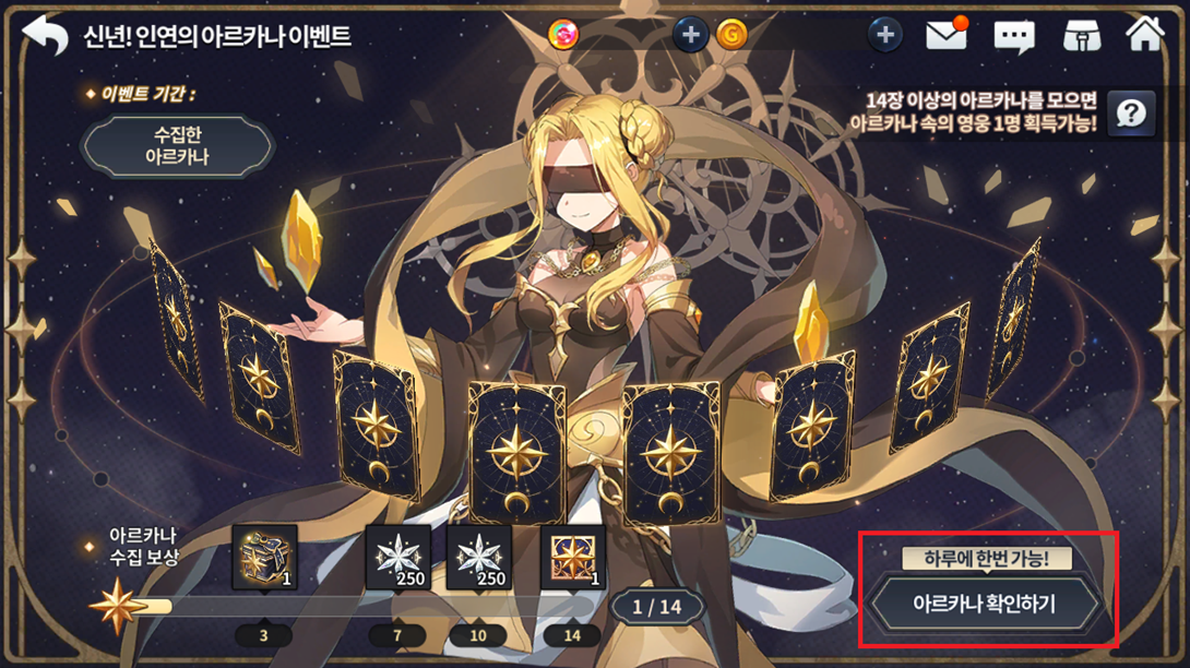 Para cada arcana coletada, você pode conferir uma mensagem do personagem respectivo e preenchendo uma barra de progresso que te dará prêmios dependendo da quantidade de arcanas coletadas durante o evento (1 arcana: Borda de perfil especial do evento / 7 arcanas: 250 cristais divinos / 10 arcanas: 250 cristais divinos) e completando as 14 arcanas, poderá selecionar um dos personagens recebidos no evento como herói SR gratuito.