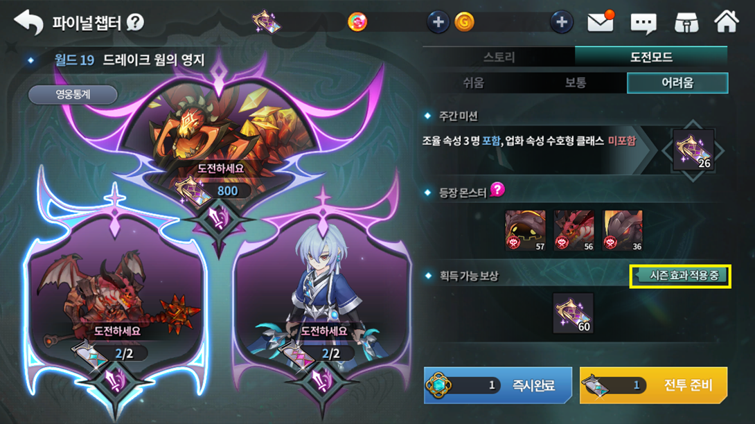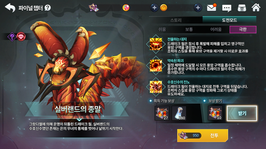 Ao concluir o modo história de cada missão pela primeira vez, você terá acesso ao modo desafio que dará os tickets do Confronto Final deste calabouço como recompensa e na última missão poderá obter as Amostras do Verme Dragão dependendo da dificuldade jogada. Você também pode conseguir os tickets nas missões semanais, lembrando que elas requerem certos tipos de classes de personagens para que possam ser acessadas na dificuldade "desafio".