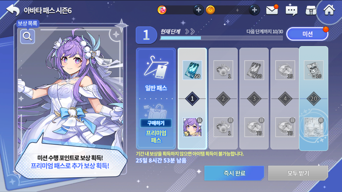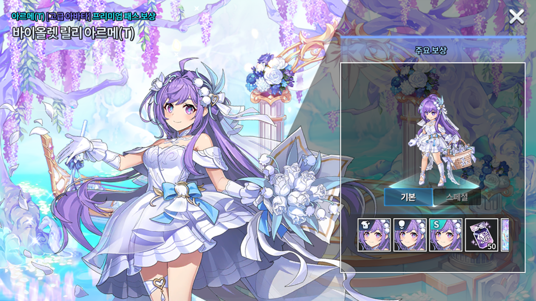 Nível Recompensa Passe Comum Recompensa Passe Premium 1º Nível 50 cupons de acessório Avatar Lirio Violeta, Arme(T) 2º Nível 15 chaves selecionáveis da Grand Fábula 75 chaves selecionáveis da Grand Fábula 3º Nível 50 cupons de acessório 75 chaves de conta selada 4º Nível 15 chaves de conta selada 75 chaves de conta selada 5º Nível 5 cupons de avatar Ilustração Lirio Violeta, Arme(T) 6º Nível 50 cupons de acessório 75 chaves selecionáveis da Grand Fábula 7º Nível 15 chaves selecionáveis da Grand Fábula 75 chaves selecionáveis da Grand Fábula 8º Nível 50 cupons de acessório 75 chaves de conta selada 9º Nível 15 chaves de conta selada 75 chaves de conta selada 10º Nível 5 cupons de avatar Avatar Lirio Violeta, Arme(T) Especial 11º Nível 100 cupons de acessório 150 chaves selecionáveis da Grand Fábula 12º Nível 30 chaves selecionáveis da Grand Fábula 150 chaves selecionáveis da Grand Fábula 13º Nível 100 cupons de acessório 150 chaves de conta selada 14º Nível 30 chaves de conta selada 150 chaves de conta selada 15º Nível 5 cupons de avatar 50 cupons de avatar 16º Nível 100 cupons de acessório 150 chaves selecionáveis da Grand Fábula 17º Nível 30 chaves selecionáveis da Grand Fábula 150 chaves selecionáveis da Grand Fábula 18º Nível 100 cupons de acessório 150 chaves de conta selada 19º Nível 30 chaves de conta selada 150 chaves de conta selada 20º Nível 10 cupons de avatar Lobby: Casamento Fantasioso (Caso você já o possua, receberá 100 cupons de avatar no lugar)
