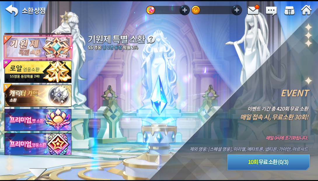 A primeira das quatro etapas do evento é uma banner de invocação diária onde o jogador poderá invocar 30 heróis gratuitamente por dia. Lembrando que é necessário consumir todas as invocações antes da virada do dia seguinte e os heróis Lee Young, Neption, Myriel, Metatron, Arsad e Gaian não estão inclusos na banner do evento.