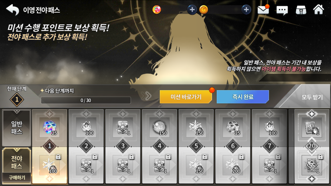 Etapa Prêmio regular Prêmio especial 1 25 Cubos de Crescimento 5 Tickets de Invocação Real 2 100 Essências de crescimento de Atirador 10 cópias da Mascote S selecionável 3 10 cópias da Mascote S selecionável 4 150 Graça das três deusas de Ernas 10 cópias da Mascote S selecionável 5 150 cristais divinos para Lee Young 6 25 Cubos de Crescimento 5 Tickets de Invocação Real 7 100 Essências de crescimento de Atirador 10 cópias da mascote rank S selecionável 8 10 cópias da mascote rank S selecionável 9 150 Graça das três deusas de Ernas 10 cópias da Mascote S selecionável 10 150 cristais divinos para Lee Young 11 50 Cubos de Crescimento 5 Tickets de Invocação Real 12 100 Essências de crescimento de Atirador 10 cópias da Mascote S selecionável 13 10 cópias da mascote rank S selecionável 14 100 Escolhas das três deusas de Ernas (Atirador) 10 cópias da mascote rank S selecionável 15 200 cristais divinos para Lee Young 16 50 Cubos de Crescimento 5 Tickets de Invocação Real 17 100 Essências de crescimento de Atirador 10 cópias da Mascote S selecionável 18 10 cópias da mascote rank S selecionável 19 100 Escolhas das três deusas de Ernas (Atirador) 20 cópias da mascote rank S selecionável 20 1x Cupom de avatar especial do Advento da Lee Young 1x cópia SR selecionável