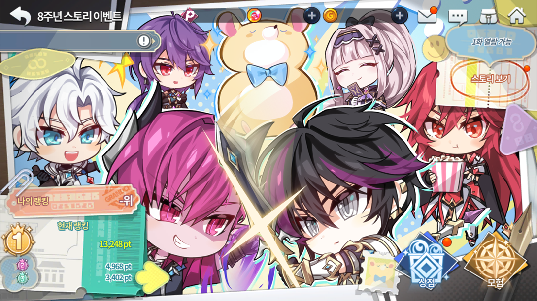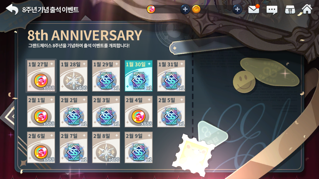 E por fim, até 02/02, teremos um evento especial de história do 8º aniversário parecido com os eventos de história, onde ao consumir energia durante o evento (Podendo ser em qualquer calabouço de aventura ou evolução colossal pelo visto), você ganha pontos que vão desbloqueando cada um dos 8 episódios da história do evento sequencialmente, obtendo 300 gemas por cada episódio aberto e lido.