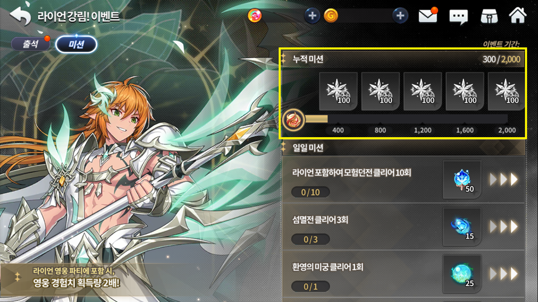 Missão Diária Conteúdo da Missão Diária Recompensa da Missão Diária Missão 1 Concluir 10 calabouços de aventura com o Ryan no time 50 essências do crescimento de Guardião Missão 2 Concluir Modo Defesa 3 vezes 15 Escolhas das Três Deusas de Ernas (Guardião) Missão 3 Concluir 1 vez o Labirinto Fantasmagórico 25 Graças das Três Deusas de Ernas Missão 4 Receber recompensa de Procurado 1 vez 25 Graças das Três Deusas de Ernas Missão 5 Jogar PvP 3 vezes 500 Bênçãos da Bravura