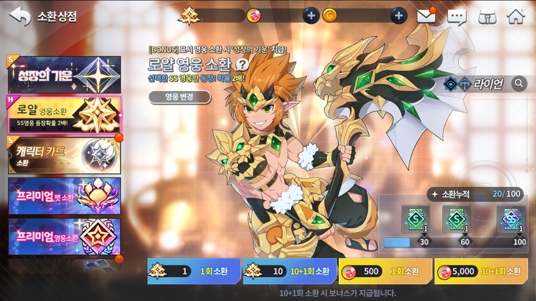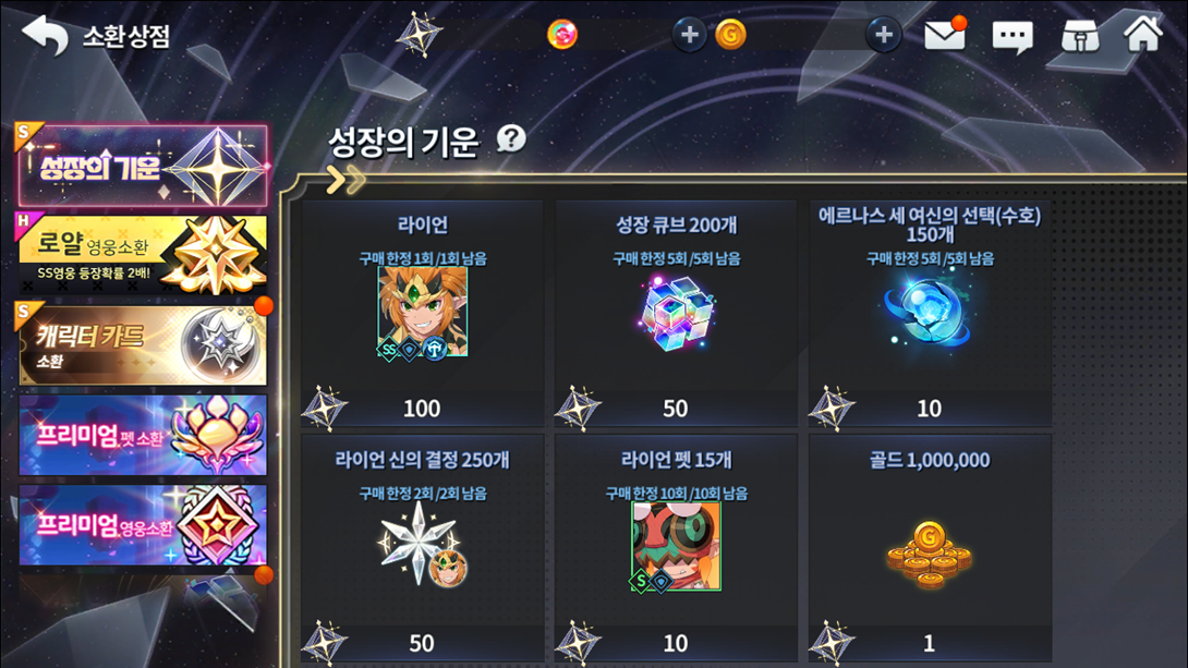 Produto Limite de compra Custo de pontos 1 Cópia da herói SR Ryan 1 100 250 cristais divinos pra Ryan 2 50 200 Cubos de Crescimento 5 50 15 cópias do Mascote S Musa 10 10 150 Escolhas das três deusas de Ernas (Guardião) 5 10 1000000 Ouro Sem Limite 1