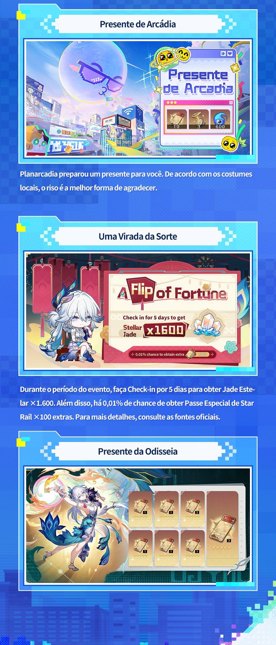④ Uma Virada da Sorte: Durante o período do evento, faça Check-in por 5 dias para obter Jades Estelar x1.600. Além disso, há 0,01% de chance de obter o Passe Especial de Star Rail (Os giros) x 100 extras. Para mais detalhes, consulte as fontes oficiais.