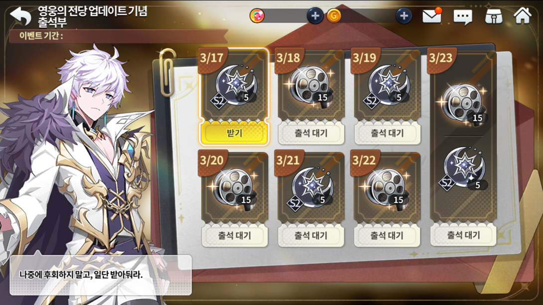 Etapa Prêmio regular Prêmio especial 1 25 Cubos de Crescimento 5 Tickets de Invocação Real 2 100 Essências de crescimento de Guerreiro 10 cópias da Mascote S Howl 3 10 cópias da Mascote S Howl 4 150 Graça das três deusas de Ernas 10 cópias da Mascote S Howl 5 150 cristais divinos para Europa 6 25 Cubos de Crescimento 5 Tickets de Invocação Real 7 100 Essências de crescimento de Guerreiro 10 cópias da mascote rank S Howl 8 10 cópias da mascote rank S Howl 9 150 Graça das três deusas de Ernas 10 cópias da Mascote S Howl 10 150 cristais divinos para Europa 11 50 Cubos de Crescimento 5 Tickets de Invocação Real 12 100 Essências de crescimento de Guerreiro 10 cópias da Mascote S Howl 13 10 cópias da mascote rank S Howl 14 100 Escolhas das três deusas de Ernas (Guerreiro) 10 cópias da mascote rank S Howl 15 200 cristais divinos para Europa 16 50 Cubos de Crescimento 5 Tickets de Invocação Real 17 100 Essências de crescimento de Guerreiro 10 cópias da Mascote S Howl 18 10 cópias da mascote rank S Howl 19 100 Escolhas das três deusas de Ernas (Guerreiro) 20 cópias da mascote rank S Howl 20 1x Cupom de avatar especial do Advento da Europa 1x cópia SR da Europa