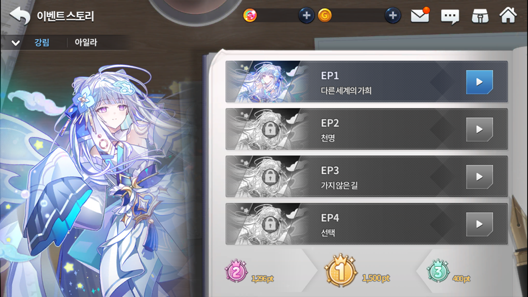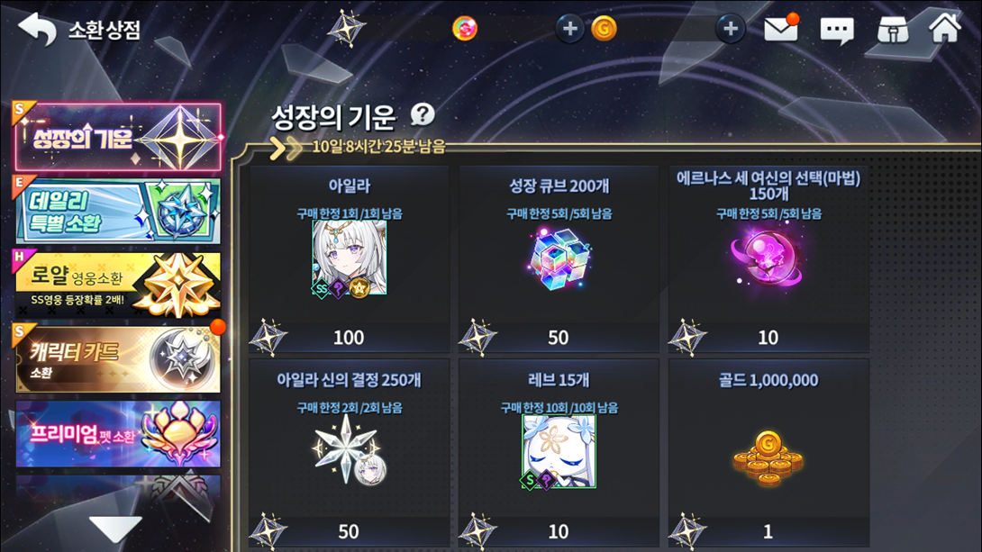 Produto Limite de compra Custo de pontos Cópia 5 estrelas do herói SR Ayla 1 100 250 Cristais Divinos 5 50 200 Cubos de Crescimento 5 50 15 cópias da mascote do Ayla (Lev) 10 10 150 Escolhas das três deusas de Ernas 5 10 1000000 Ouro Sem Limite 1