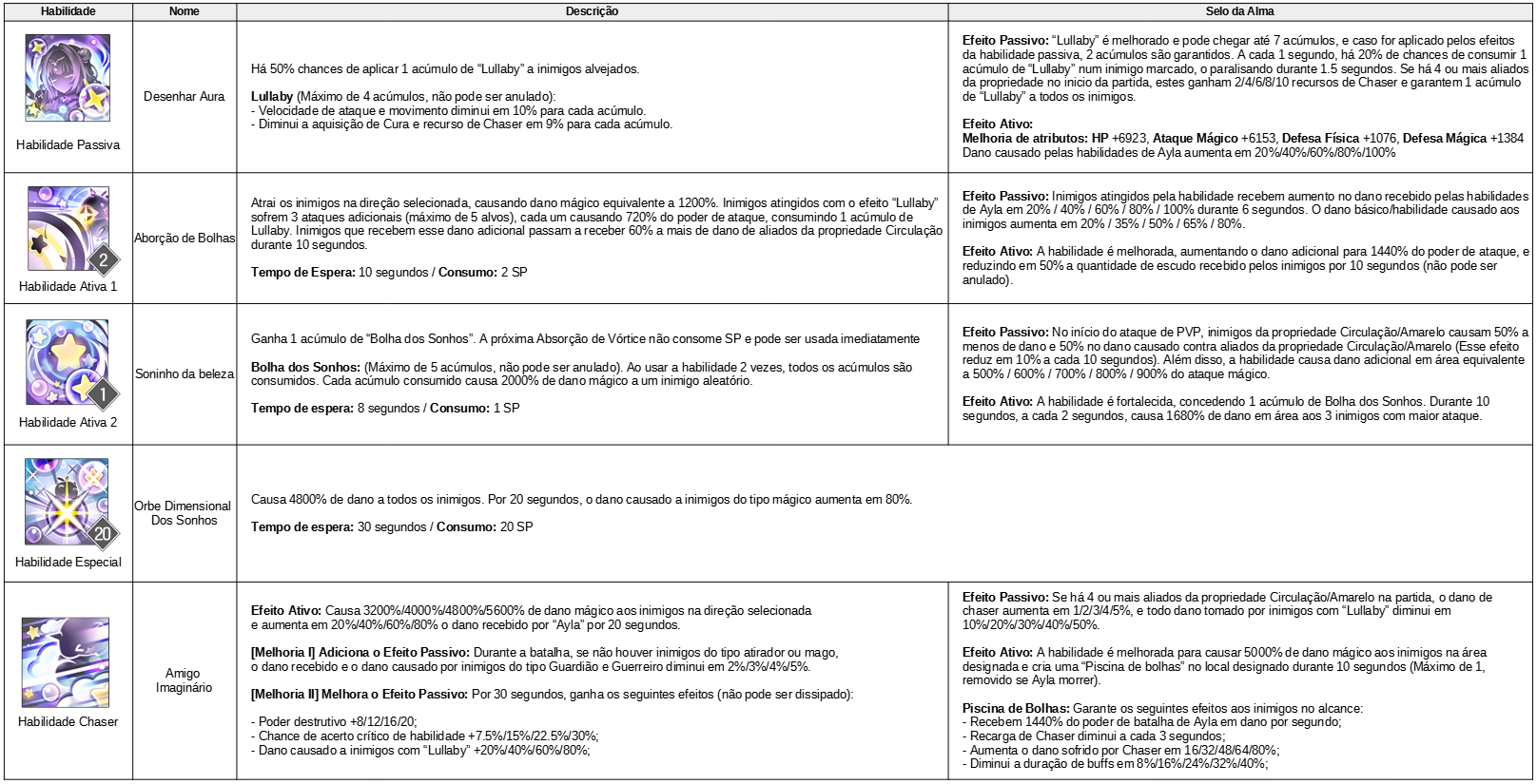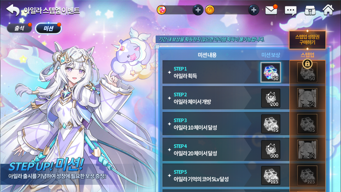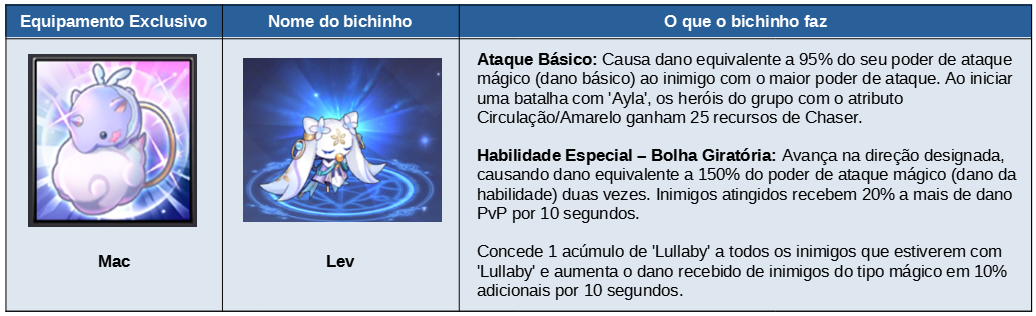 Missão Premiação Conseguir a Ayla 50 Cubos de Crescimento da Ayla Abertura do Chaser 200 Essências do Crescimento de Mago 50 cópias da mascote Lev Alcançar Chaser nível 10 75 Cubos de Crescimento da Ayla Alcançar Chaser nível 20 300 Essências do Crescimento de Mago 80 cópias da mascote Lev Atingir nível 5 do Selo da Alma 125 Cubos de Crescimento da Ayla Abrir núcleo do corpo Ticket de Avatar especial da descendência da Ayla 1 cópia SR d Ayla Abrir Descendência 500 Cristais Divinos da Ayla 1000 Cristais Divinos da Ayla