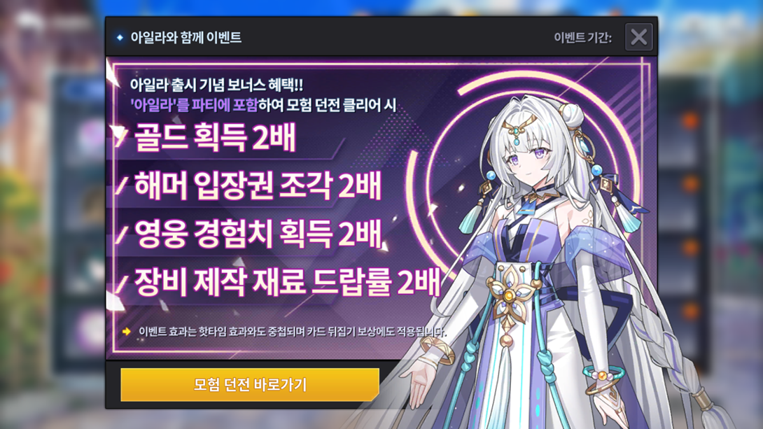 No mesmo período jogando junto com a Ayla em qualquer calabouço de aventura ou evolução colossal, o jogo te dará dobro de ouro, fragmentos de tickets de entrada do Martelo de Ernasis, experiência de herói e chance de aquisição de materiais para equipamentos de Raid e Fenda Dimensional!