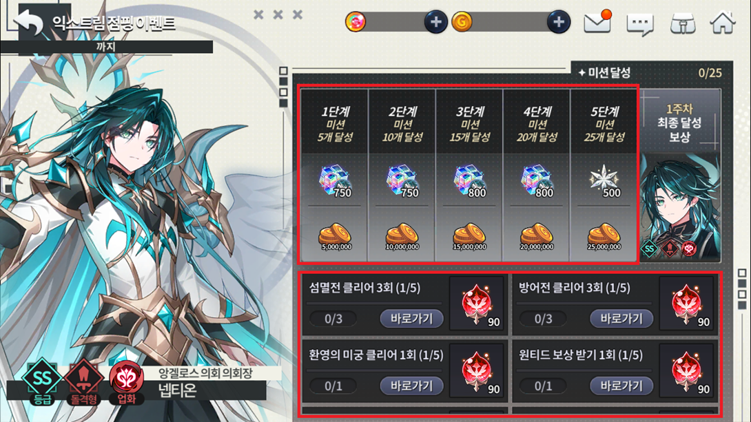 Etapa Objetivo Recompensa Etapa 1 Concluir 5 Missões de Classe 750 Cubos de Crescimento Exclusivos + 5,000,000 Ouro Etapa 2 Concluir 10 Missões de Classe 750 Cubos de Crescimento Exclusivos + 10,000,000 Ouro Etapa 3 Concluir 15 Missões de Classe 800 Cubos de Crescimento Exclusivos + 15,000,000 Ouro Etapa 4 Concluir 20 Missões de Classe 800 Cubos de Crescimento Exclusivos + 20,000,000 Ouro Etapa 5 Concluir 25 Missões de Classe 500 Cristais Divino + 25,000,000 Ouro Recompensa Final - 1 cópia SR do herói escolhido